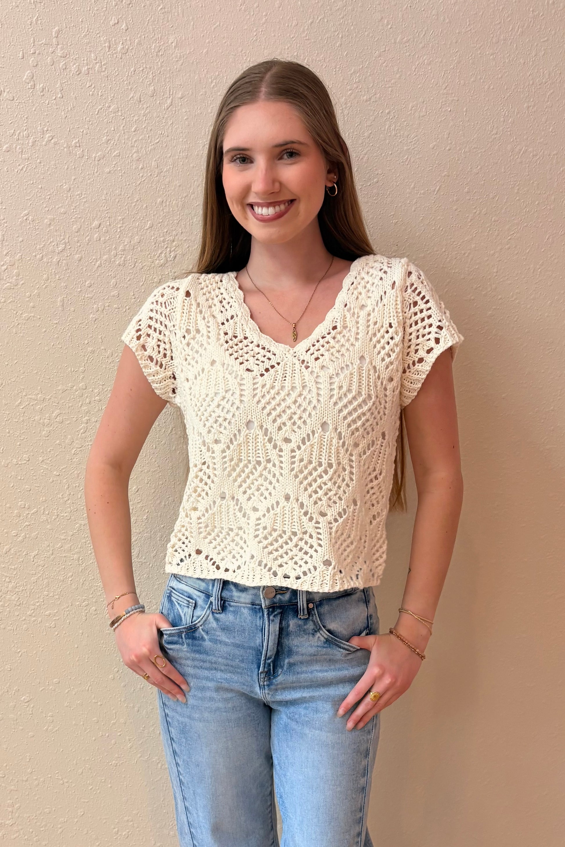 This cream crochet knit top features short sleeves and a flattering v-neckline. The slightly cropped silhouette works beautifully layered over tanks or worn with dresses for effortless boho style.