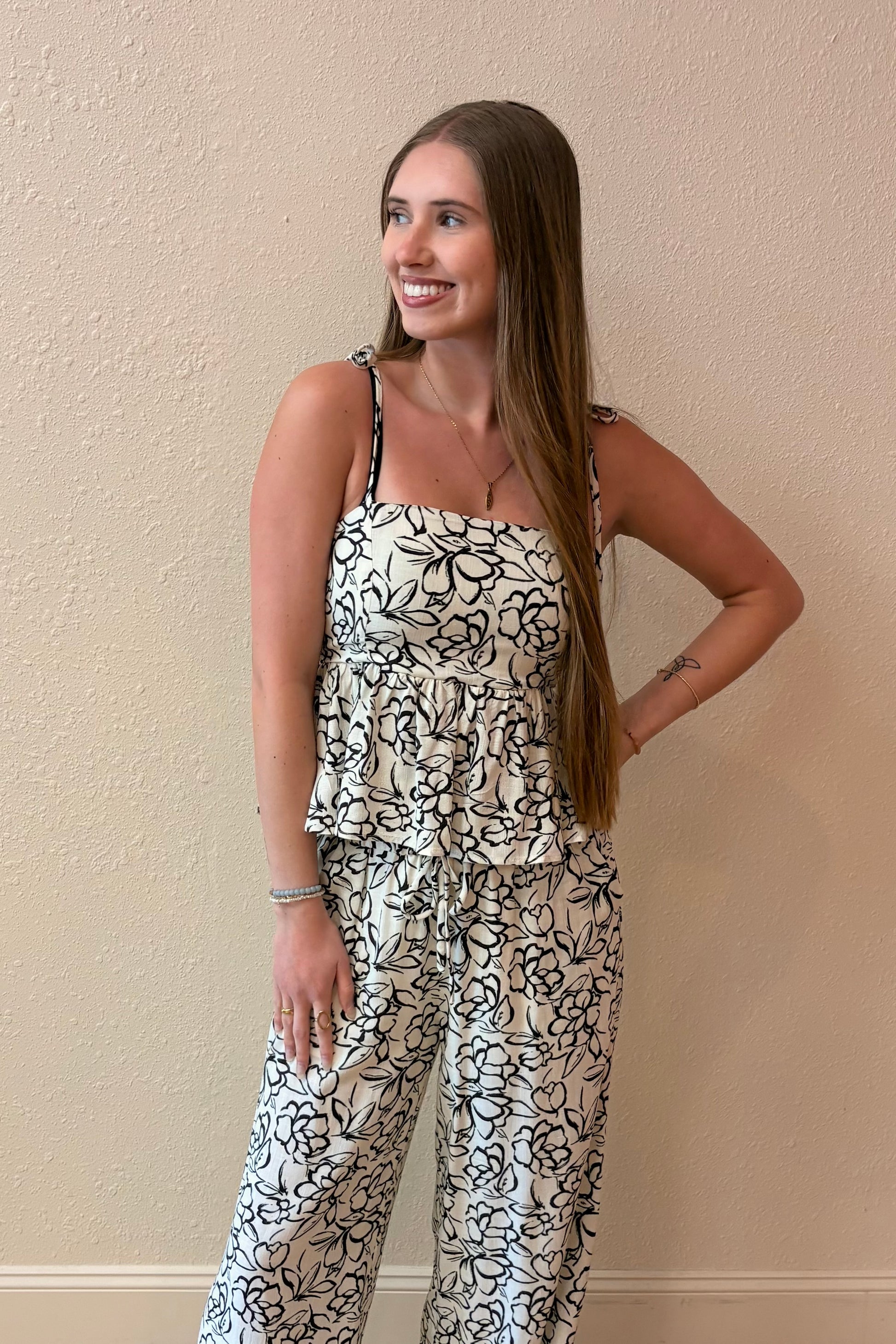 Crisp white tank with bold black florals and a flattering peplum silhouette. Smocked back and adjustable tie straps for the perfect fit. Pairs beautifully with our Ava Floral pants for an effortless coordinated look.