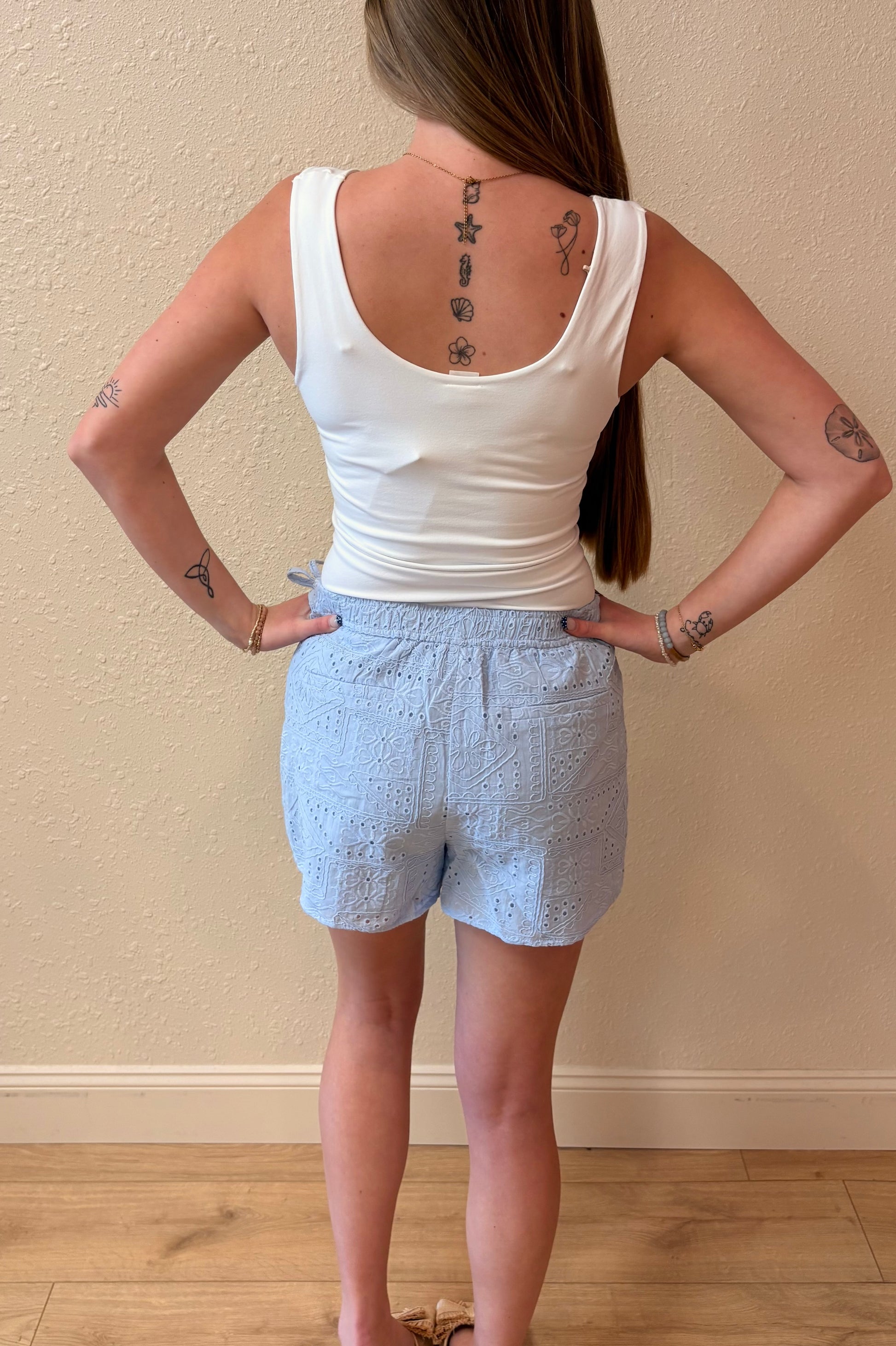 The Chelsea Eyelet Embroidered Wrap Skort combines style and comfort in one piece. Featuring delicate eyelet embroidery in soft light blue, it showcases a wrap skirt front with shorts in back—perfect for any occasion. Feminine, versatile, and effortlessly chic.