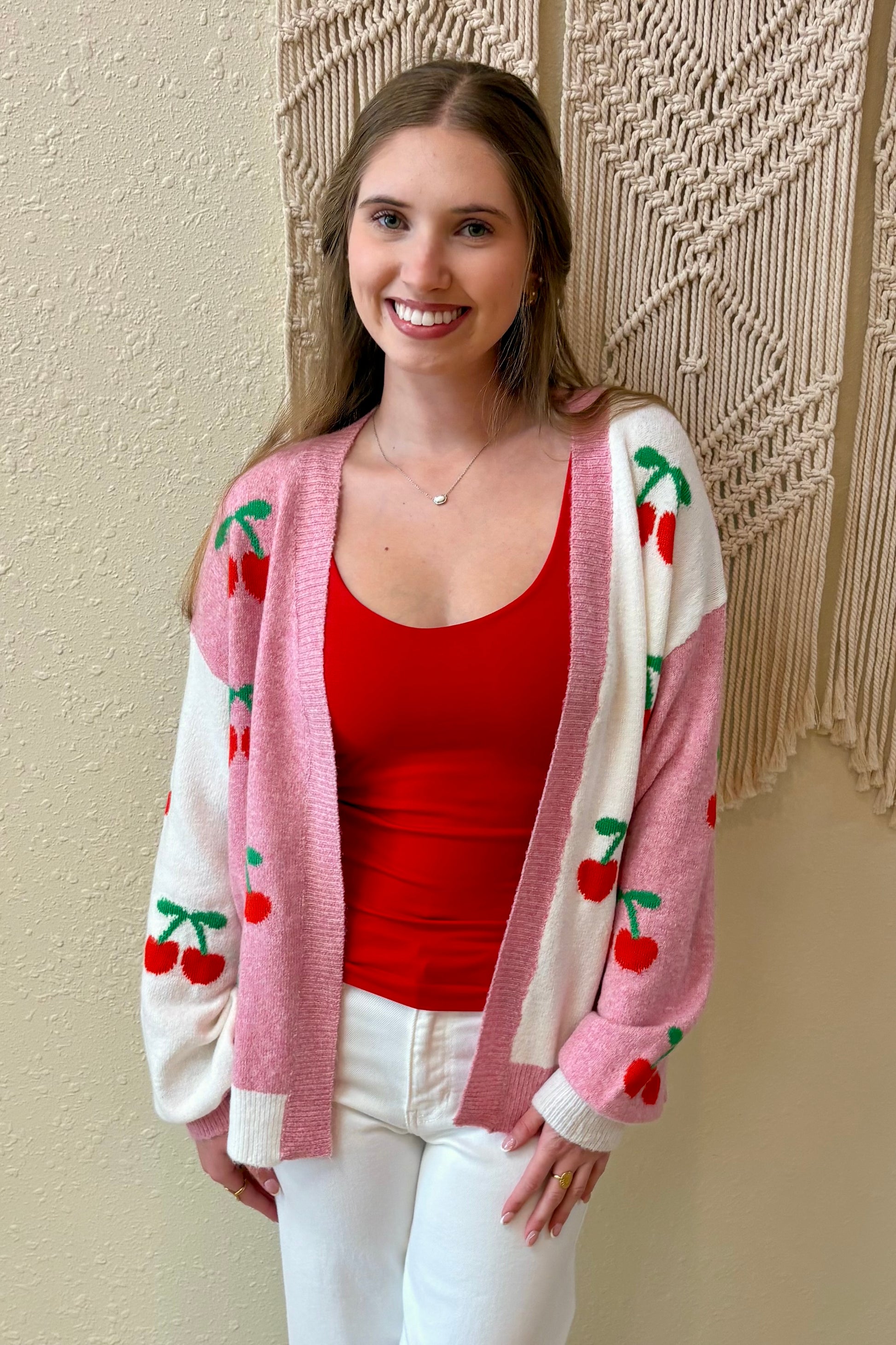 Slip on this charming open cardigan and instantly elevate your everyday style. Featuring a delightful cherry print set against a colorblock design, it's the perfect layering piece to throw over tanks, tees, or dresses. Crafted from wonderfully soft fabric, this cardigan brings both comfort and personality to your wardrobe with its playful, feel-good vibe.