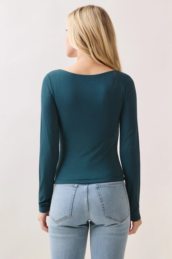 This refined long sleeve knit top features a sophisticated double-layer construction with a flattering square neckline and fitted silhouette. Crafted from an exceptionally soft fabric, it delivers both comfort and polished style for versatile everyday wear or layered looks.
