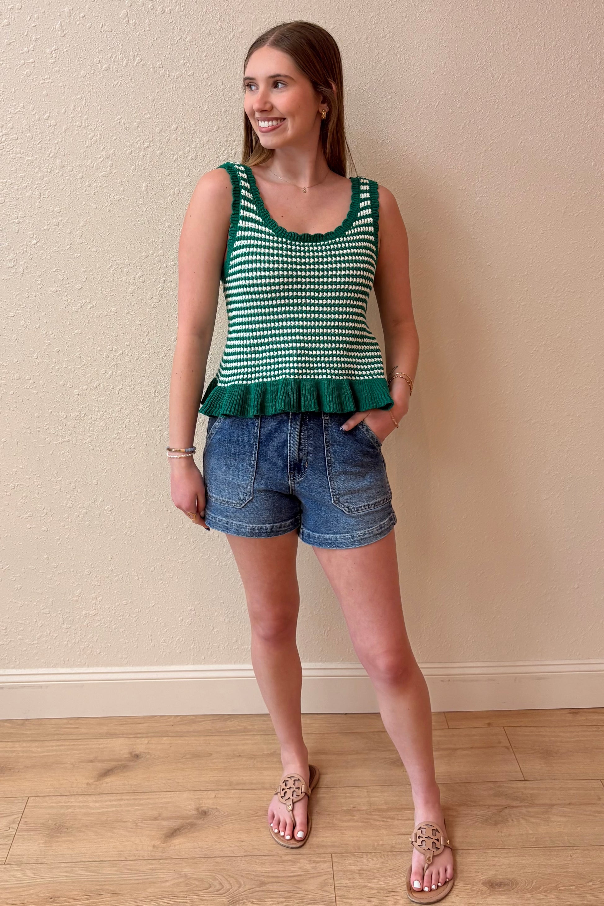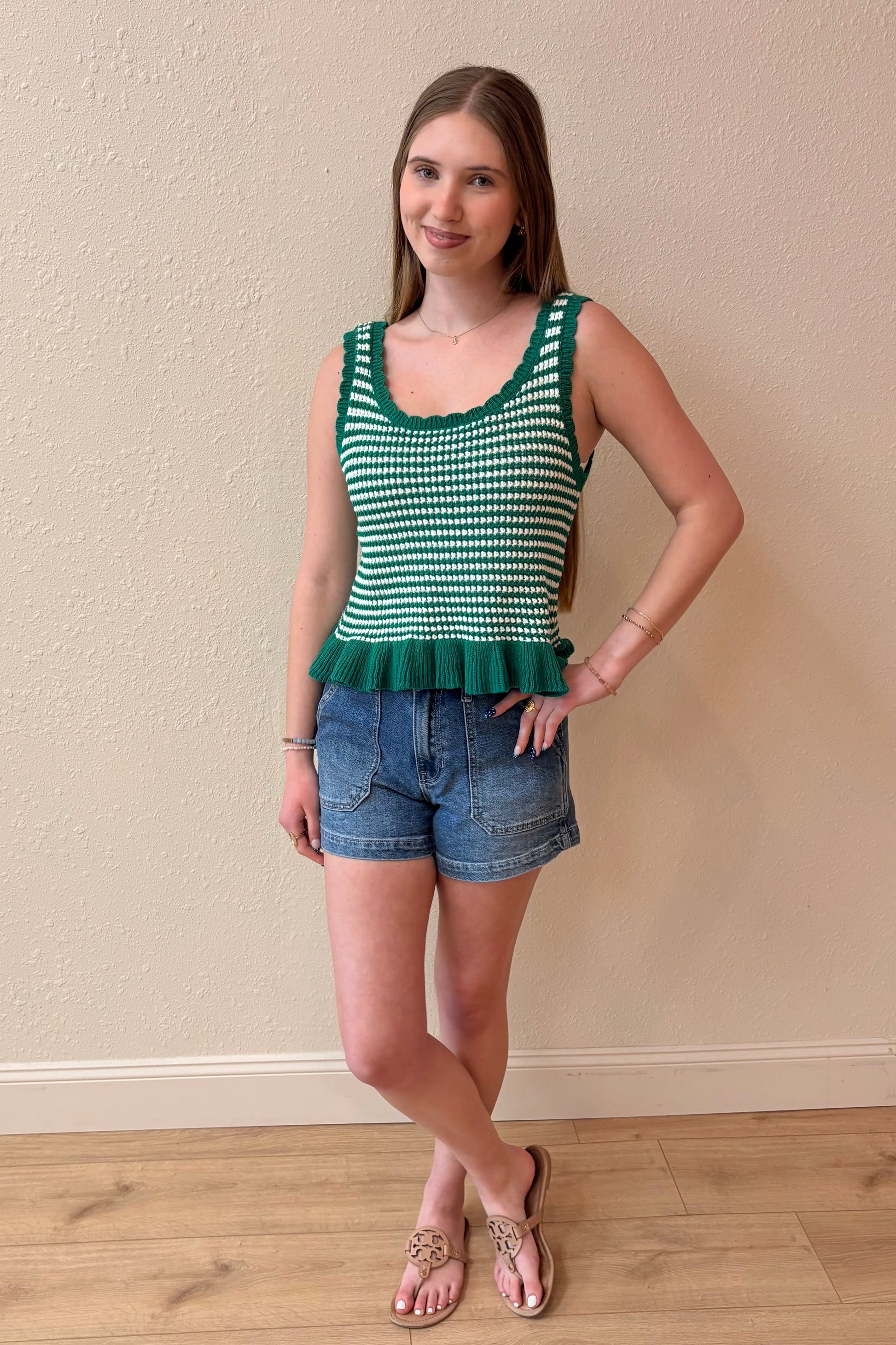 This charming tank top features a playful green and white striped pattern with a fun peplum ruffle at the hem. Perfect for adding a touch of whimsy to your everyday wardrobe, it's a versatile piece that pairs beautifully with jeans, shorts, or skirts for a fresh, cheerful look.
