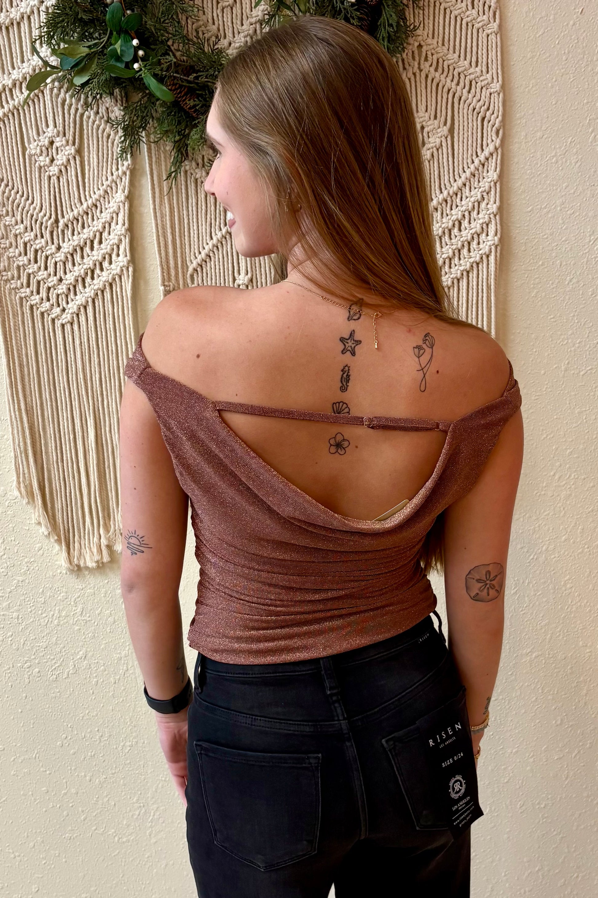 This elegant off-the-shoulder top features a soft dusty pink hue with shimmering gold accents that catch the light beautifully. The ruched side detailing creates a flattering silhouette, while the adjustable back ensures a custom fit for every body type. Perfect for adding a little glamour to your everyday look or dressing up for a special occasion.
