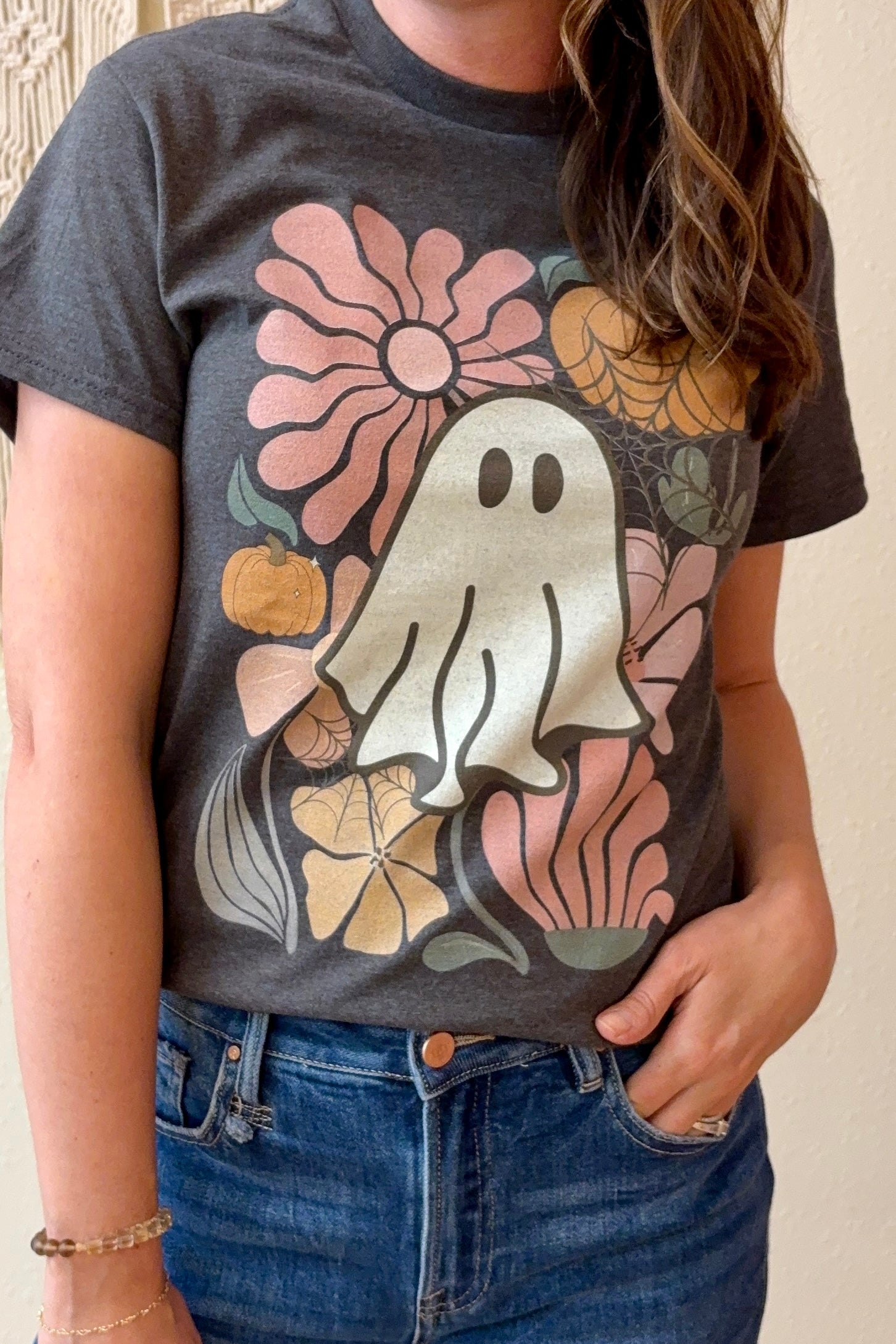 Celebrate the spooky season with a charming twist. This cute ghost adorned with flowers and pumpkins makes for a delightful Halloween t-shirt. Designed with a relaxed, slightly oversized fit for comfortable wear.