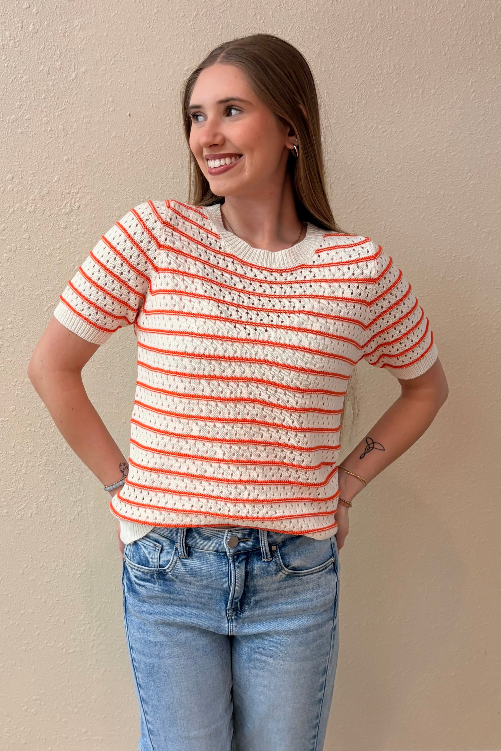 Effortless layering meets timeless style with this open weave knit top. The crisp white base and vibrant orange stripes create a fresh, versatile look that pairs beautifully with everything in your wardrobe. Perfect for transitional seasons, the breathable short sleeves keep you comfortable while the relaxed fit flatters all body types.