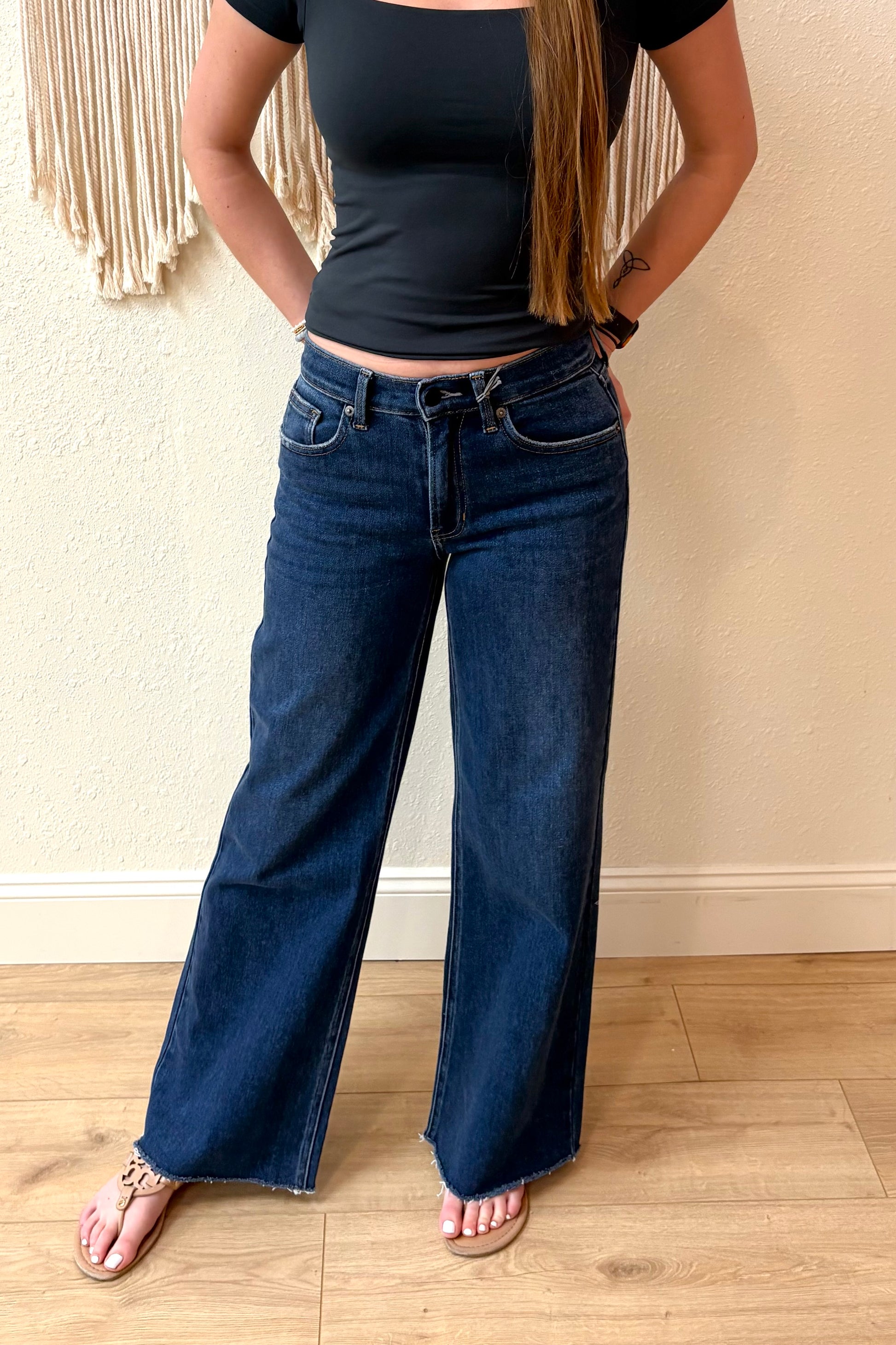 Discover the perfect blend of style and comfort with these Just USA wide leg jeans. Featuring a sleek dark denim wash and a slimmer silhouette, they offer a flattering fit that works for any occasion. The full-length cut gives you endless styling possibilities, whether you're dressing up or keeping it casual. A wardrobe essential that feels as good as it looks.