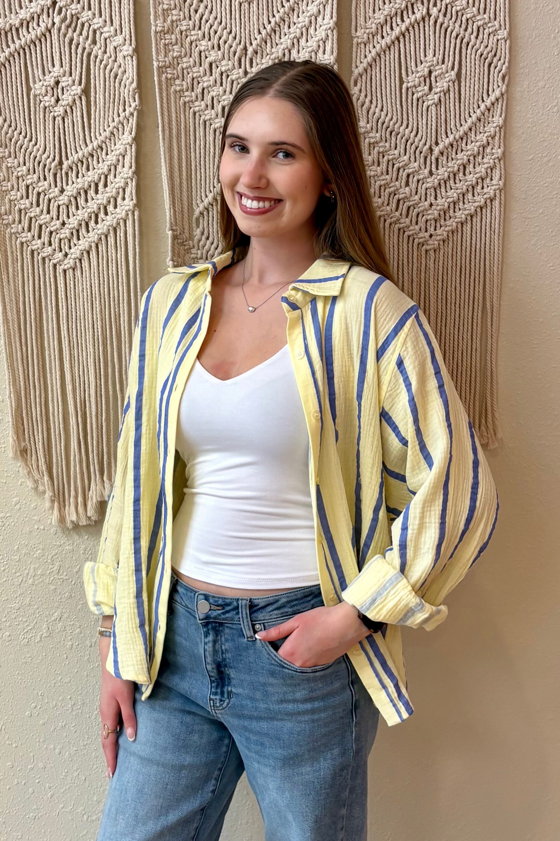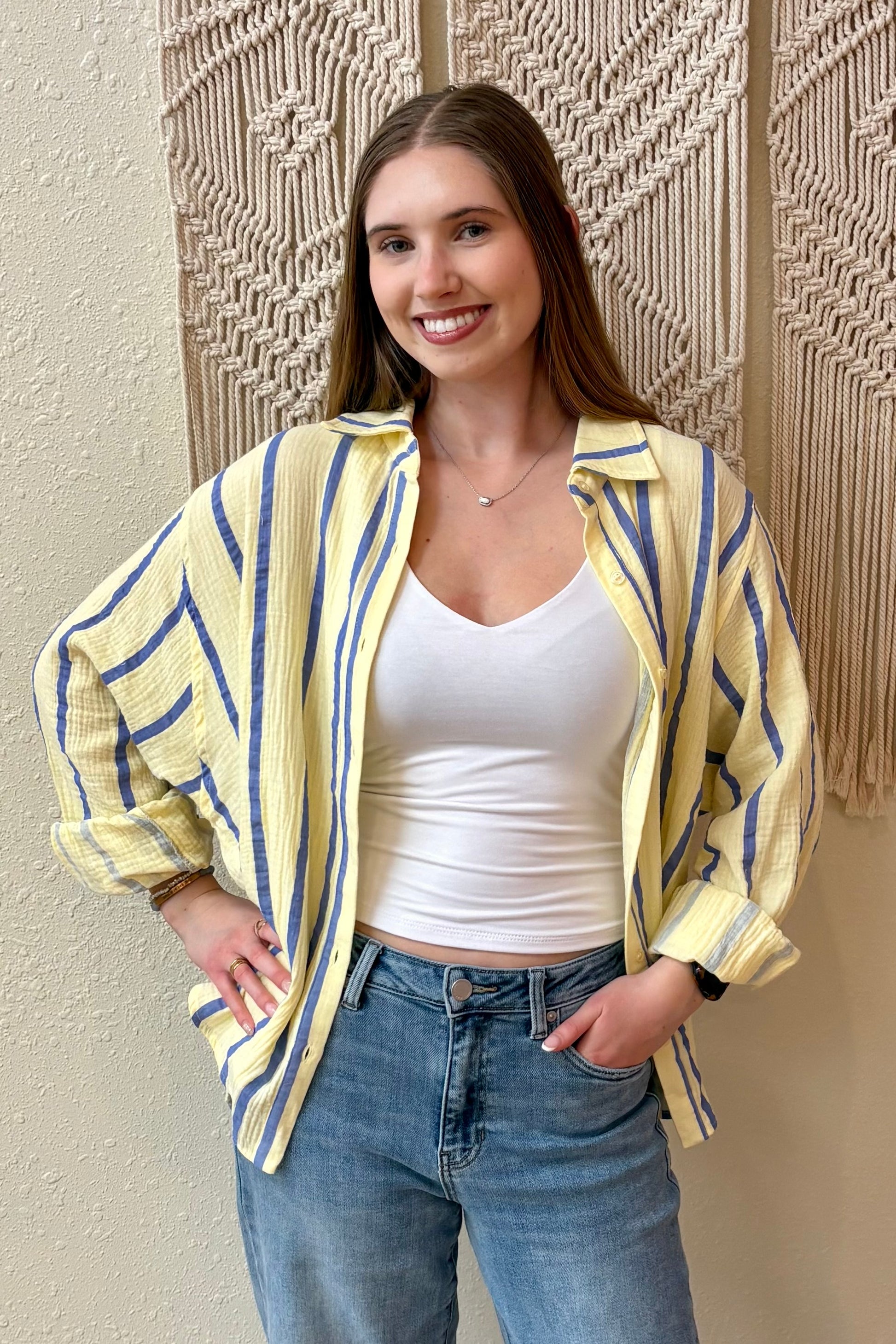 Crafted from breathable cotton gauze, this charming button-front shirt features cheerful yellow and blue stripes. Perfect as a lightweight layer or standalone piece, it's soft against the skin and effortlessly stylish for any occasion.