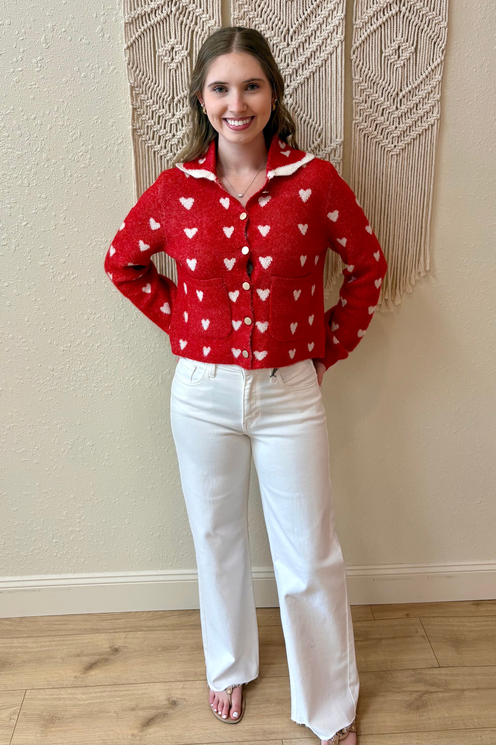 Slip into cozy charm with this delightful cardigan sweater, showcasing a classic red base adorned with sweet white hearts. The soft, touchable fabric pairs beautifully with a charming scalloped collar and gleaming gold button closures for an effortlessly put-together look.