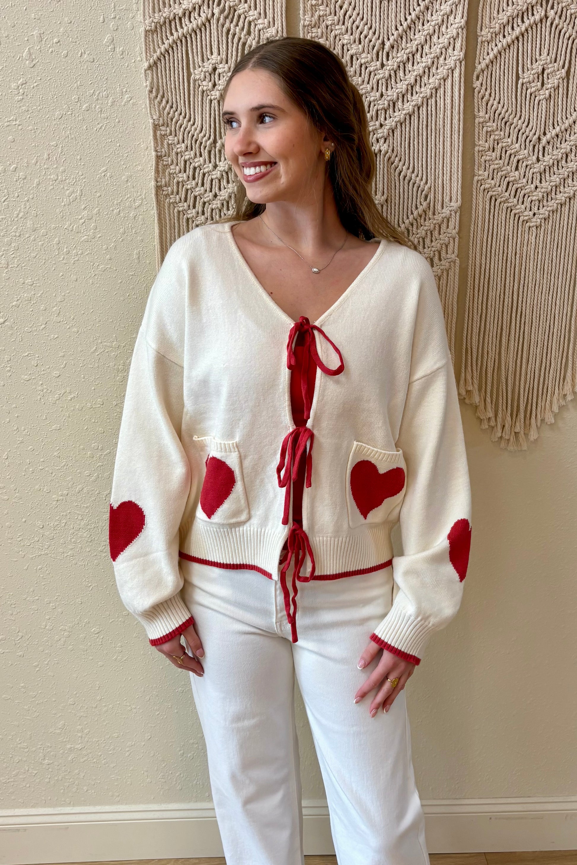 Wrap yourself in warmth with this charming cream cardigan featuring a sweet tie-front closure and delightful heart embellishments on the pockets and sleeves. Whether you're celebrating Valentine's Day or just want to add a touch of playful elegance to your everyday look, this cozy sweater delivers comfort and style in one delightful package.