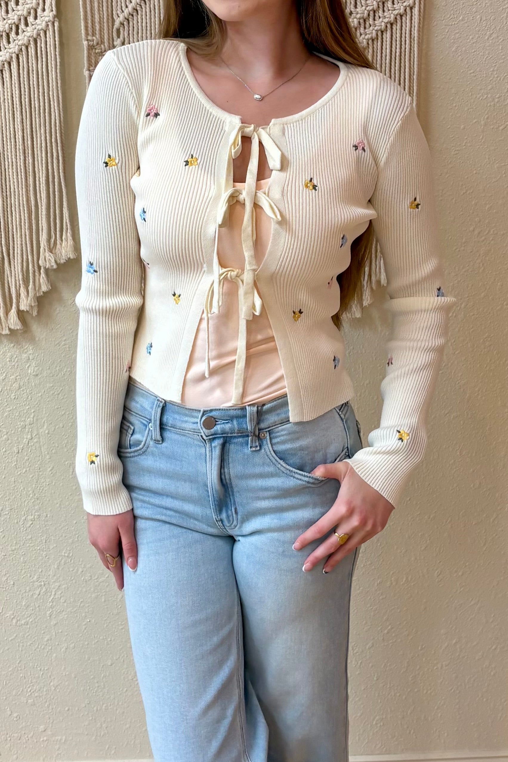 Slip on this charming ivory cardigan and brighten your day with delicate floral embroidery in soft pink, yellow, and blue. The ribbed knit fabric feels cozy yet breathable, while three convenient front ties let you adjust the fit just right. Perfect for layering over dresses or pairing with your favorite jeans, this lightweight piece brings effortless style and warmth to any outfit.