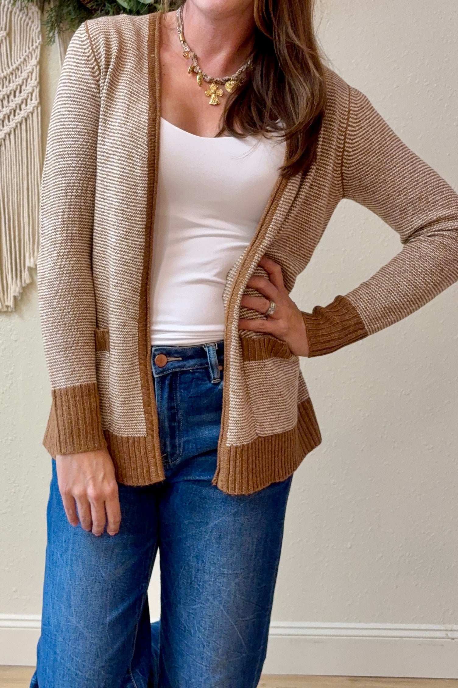 Effortlessly chic and wonderfully versatile, this open cardigan sweater features timeless mocha and white stripes that pair beautifully with everything in your wardrobe. Layer it over your favorite tees or dresses for an instantly polished look that feels relaxed and put-together. The perfect go-to piece for casual days that still feel special.