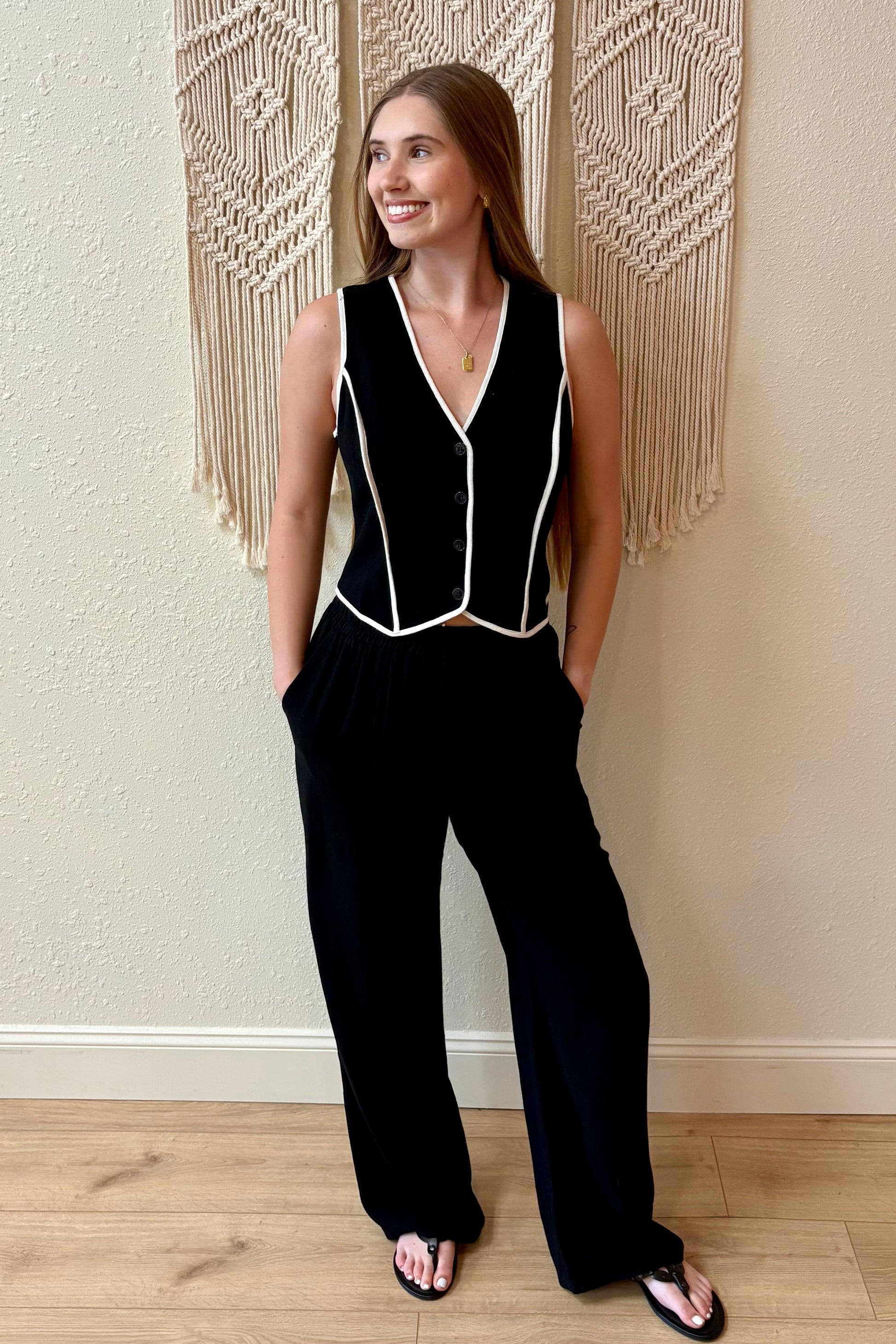 This black linen vest features white contrast binding and a button-front design, fully lined for comfort. Complete your outfit by pairing it with our black linen pants for a polished ensemble.