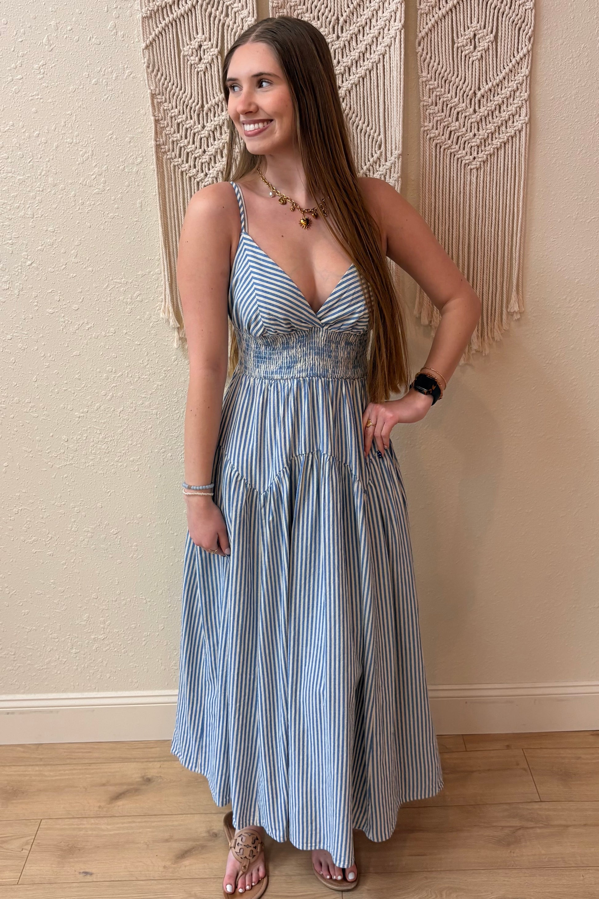 Slip into effortless elegance with this charming maxi dress featuring soft light blue and white stripes. The smocked elastic waistband creates a flattering silhouette, while adjustable straps ensure the perfect fit. Practical side pockets add everyday functionality to this versatile piece that transitions beautifully from casual outings to relaxed gatherings.