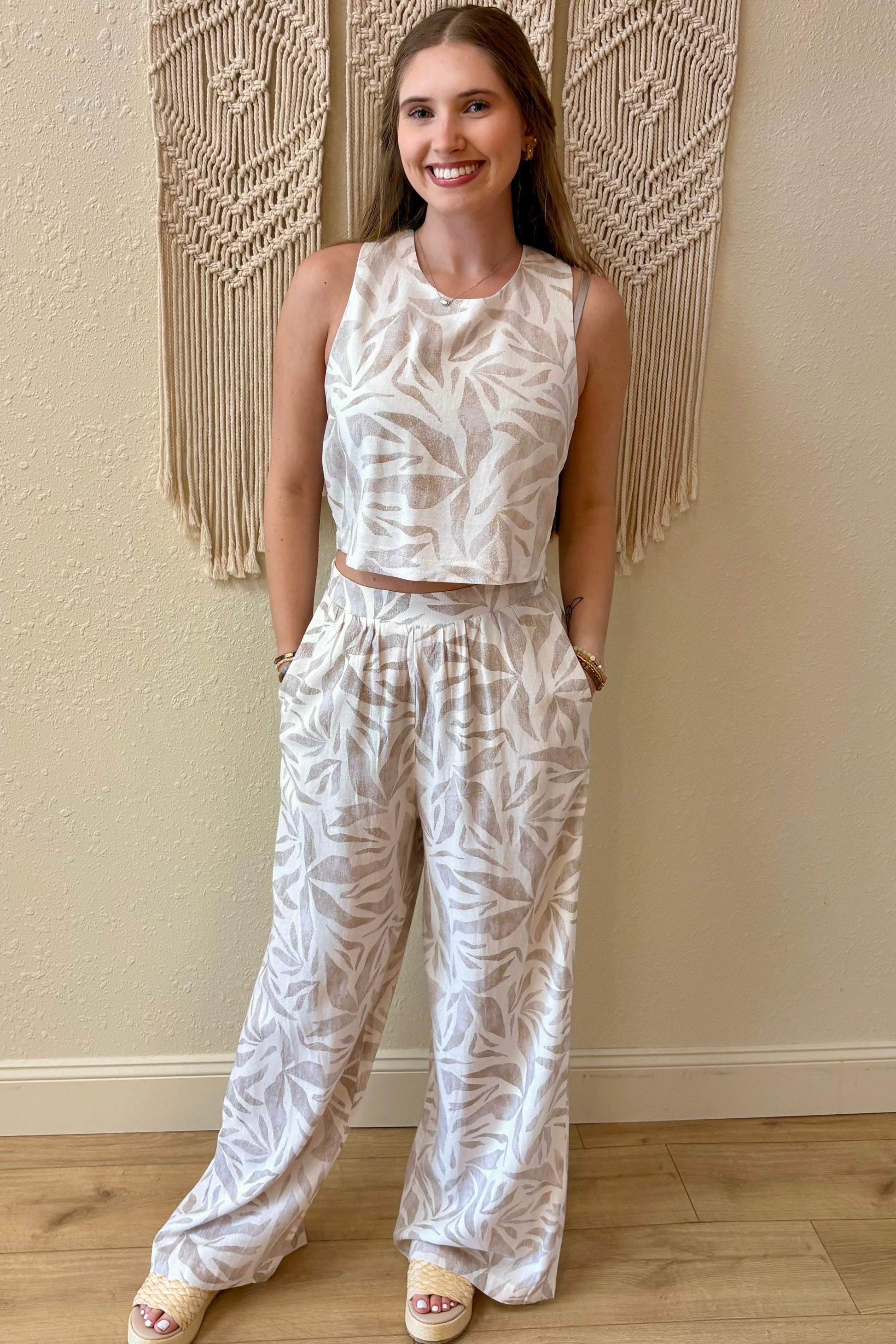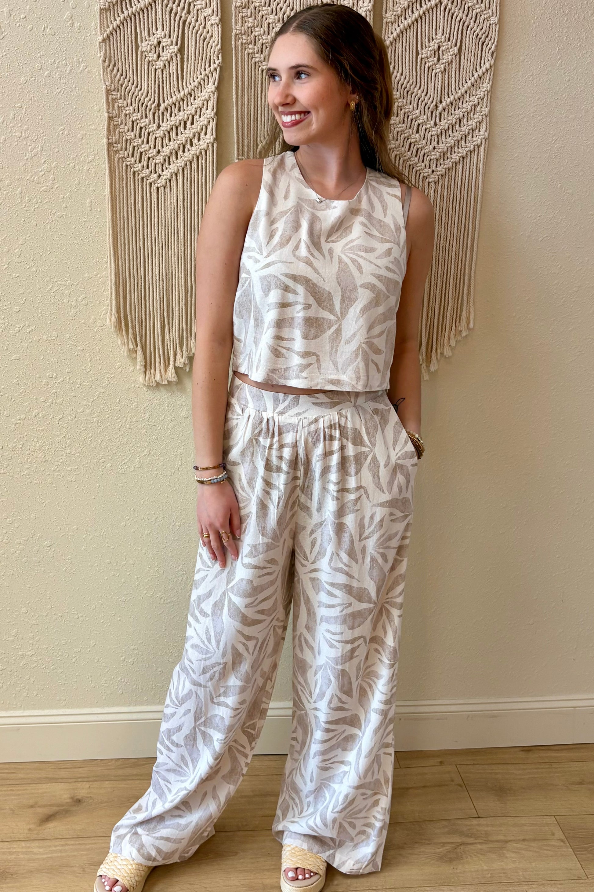 Effortless style meets comfort in this breezy tank top featuring a soft linen blend and charming tropical leaf design. The adjustable tie back adds a playful touch while keeping things cool and relaxed. Coordinate it with our Tulum pants to create a perfectly put-together look that's ready for any warm-weather adventure.